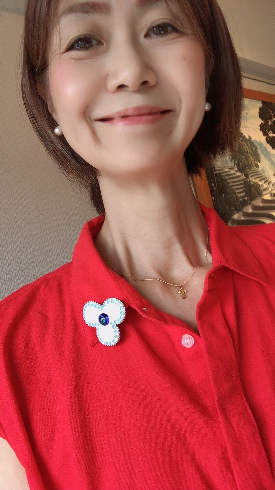 爽やかな色なので、オレンジレッドのお洋服に合わせたり、ターコイズやイエロー、ネイビーにも