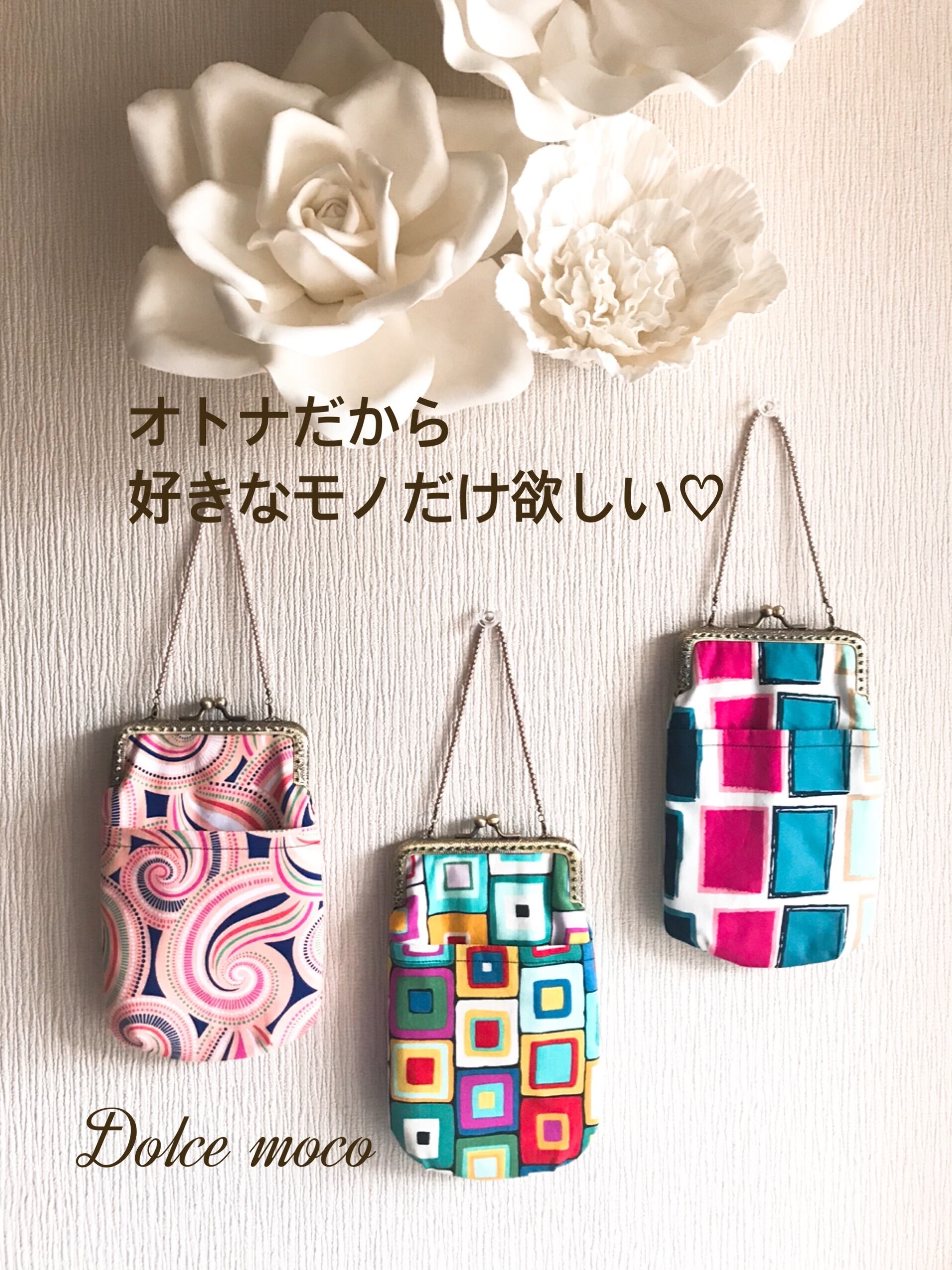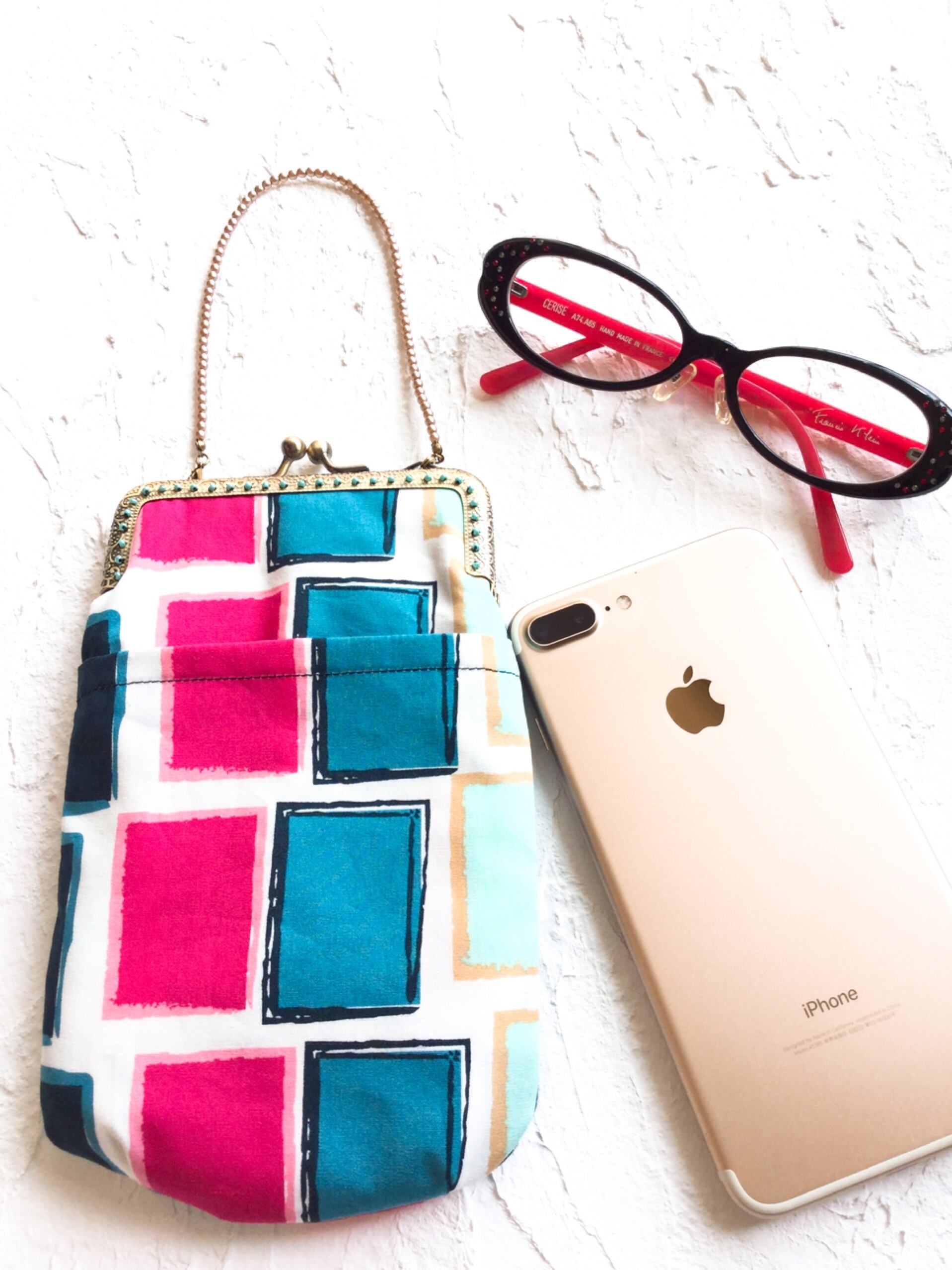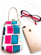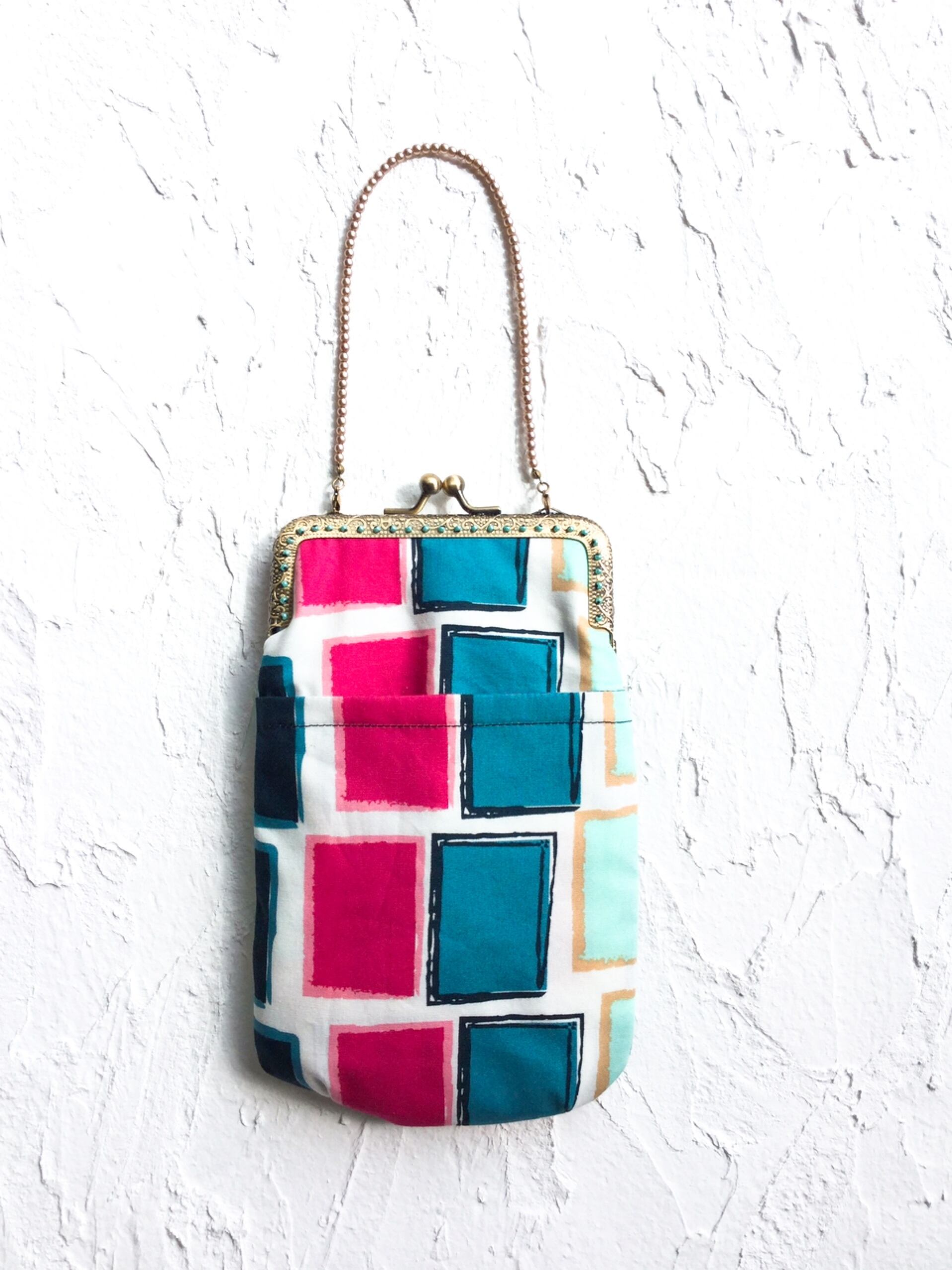 表布は個性溢れるアメリカンファブリック、ケイタイを入れる外ポケット付き。