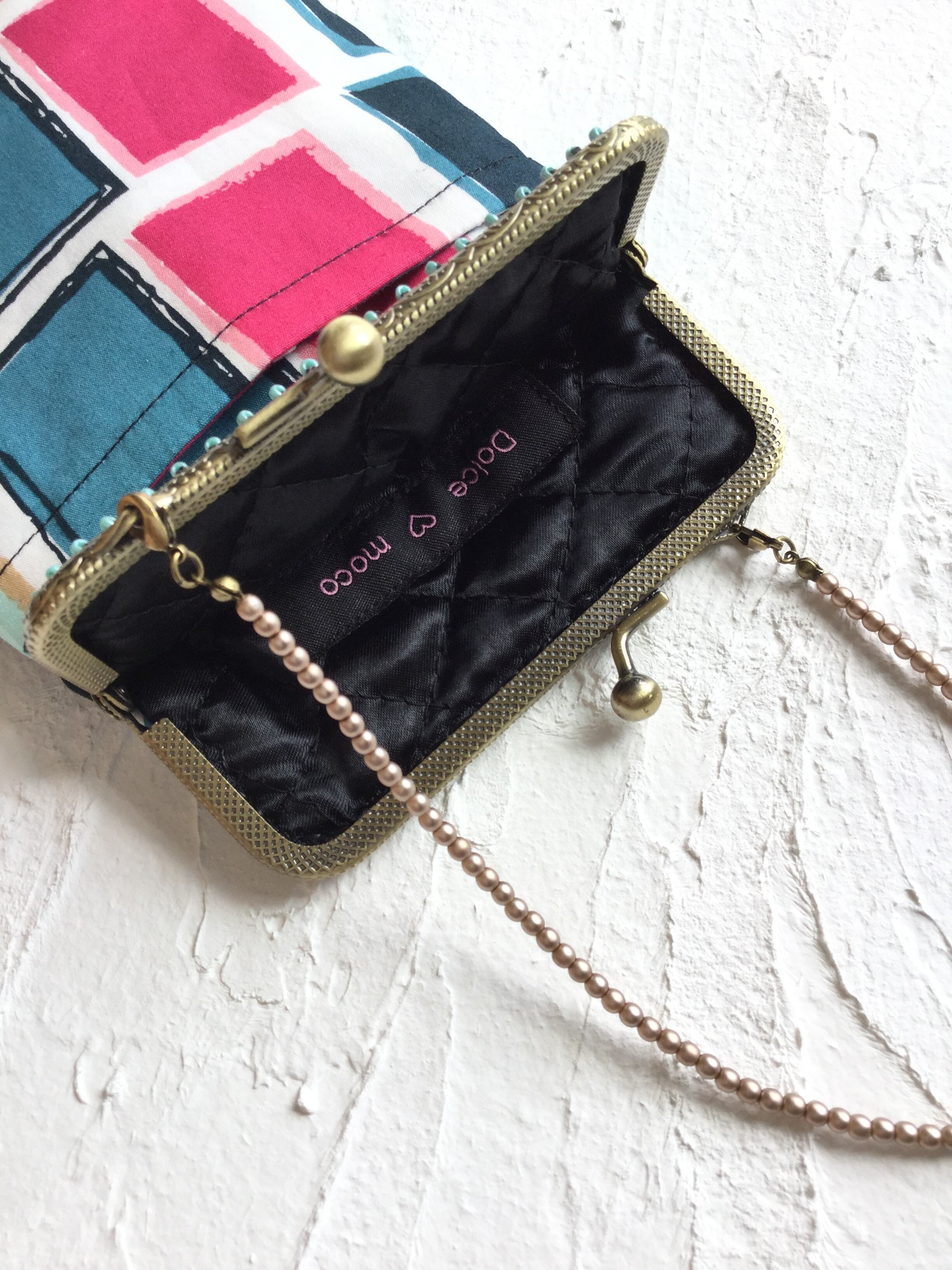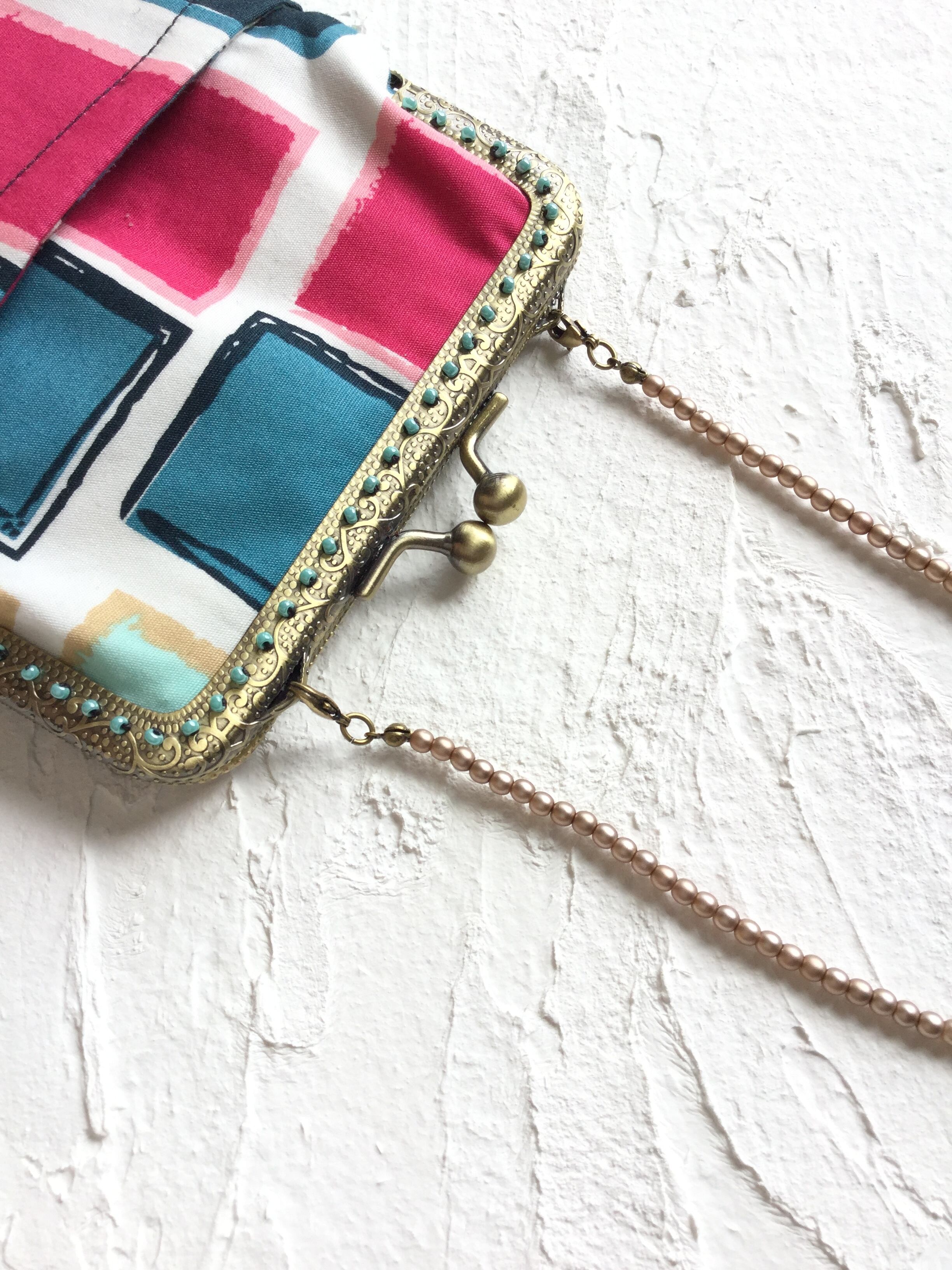 口金にはファブリックの色に合わせて小さなビーズを縫い付け、チェコガラスでつくった持ち手も印象的です。