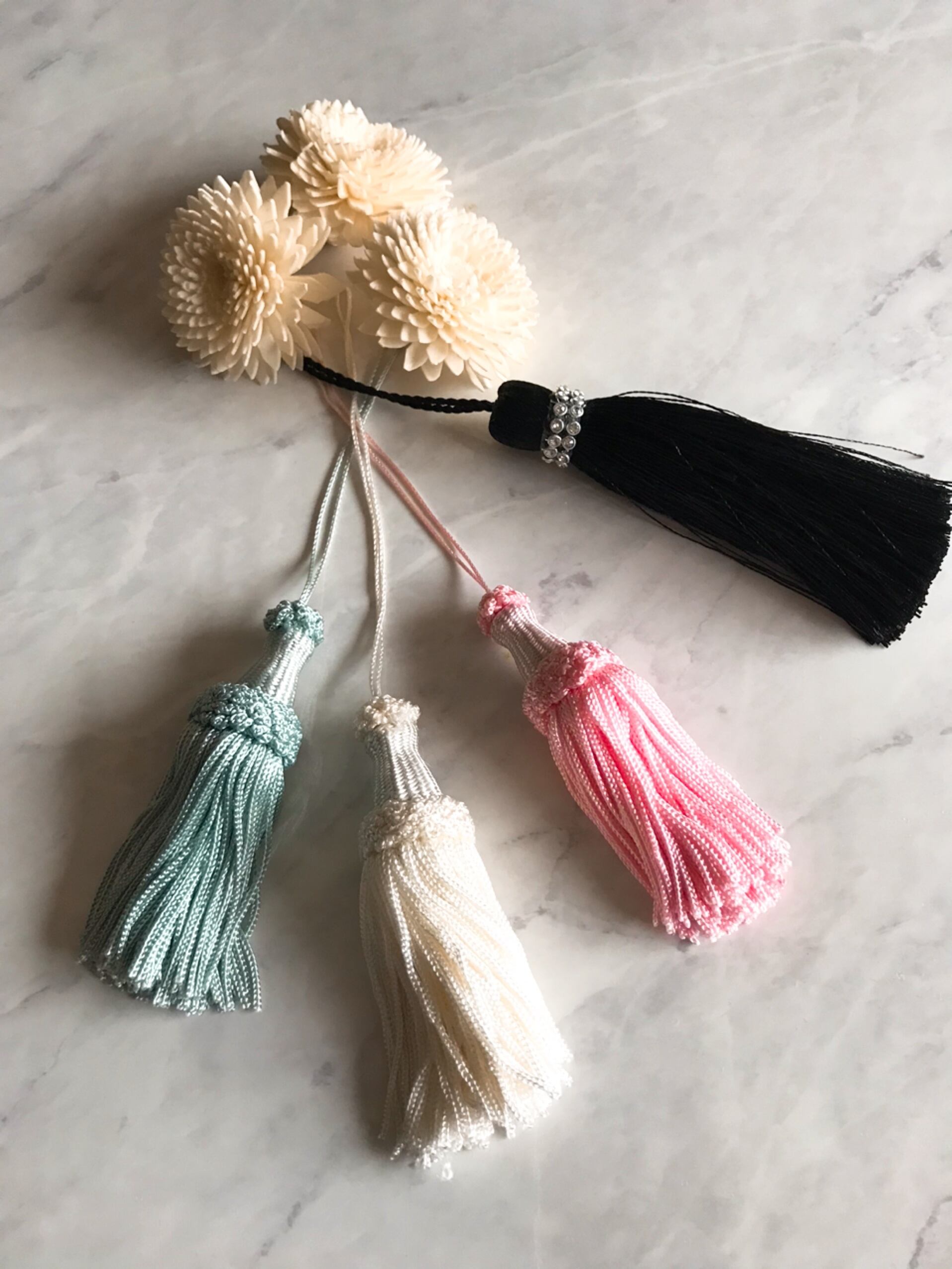 タッセルはブラック、ホワイト、ピンク、ブルーから選べますので、お好きな色をチョイスしてくださいね♡