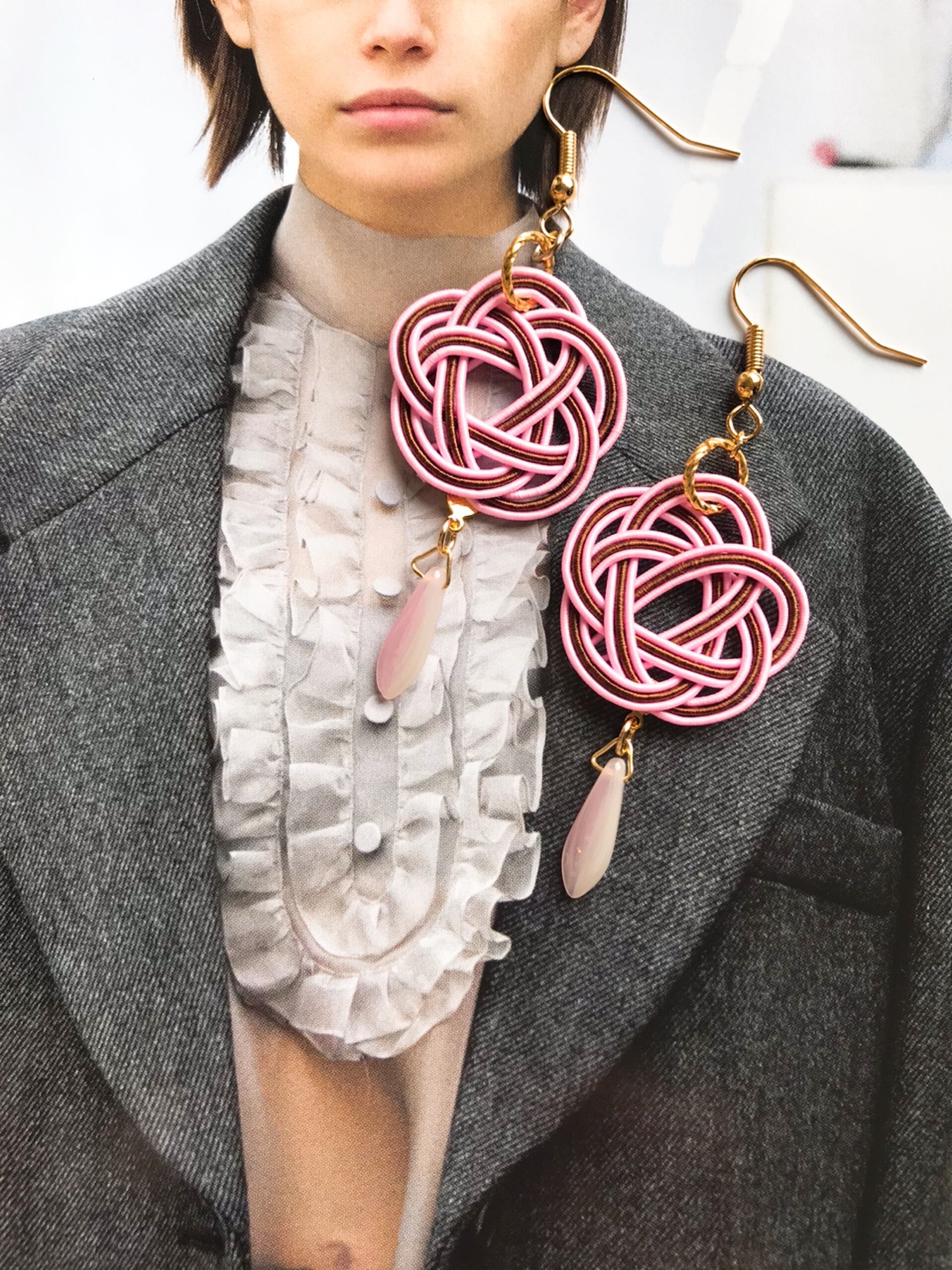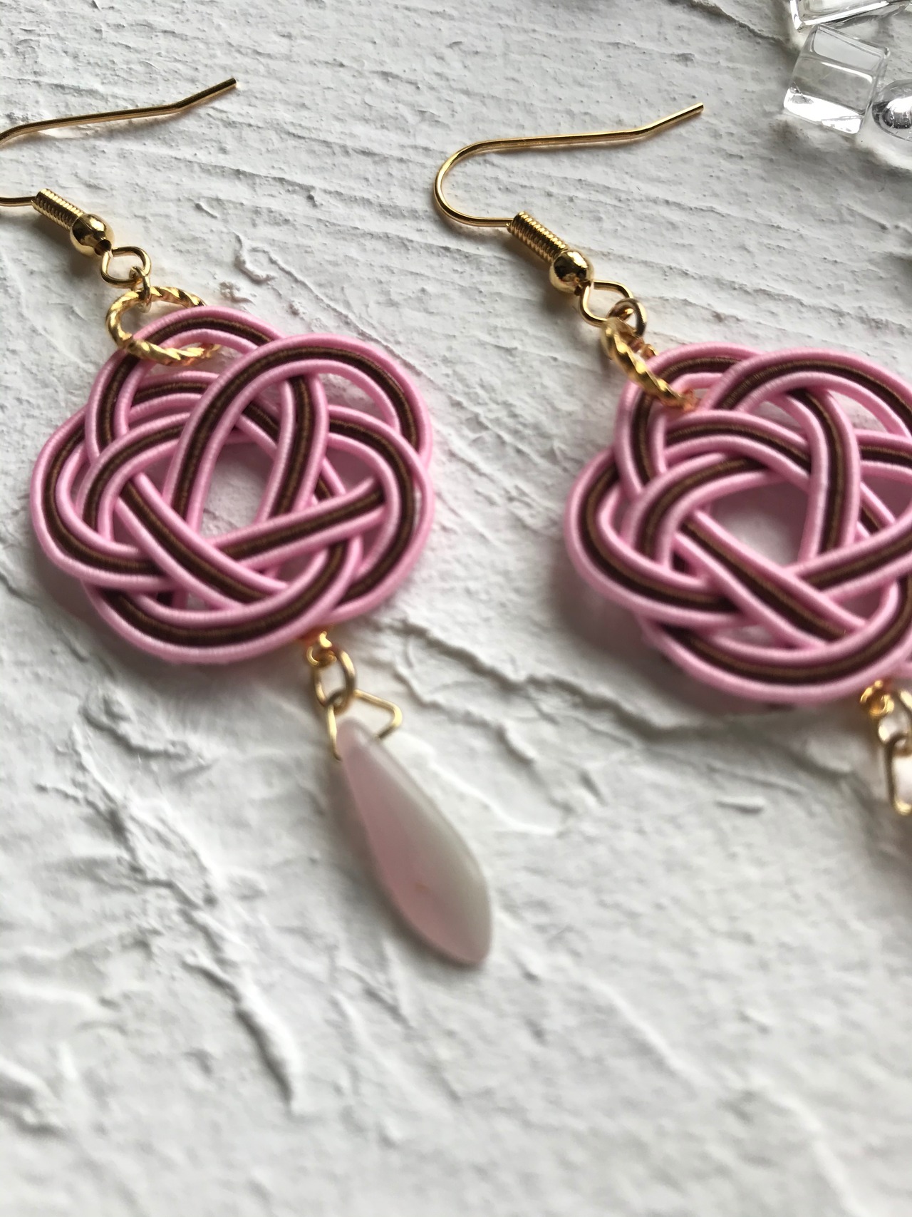 コチラのピアスは、桜色と茶色のコントラストが光ります。ローズベージュのチェコビーズと組み合わせたキュートな印象。